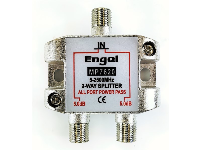 2-way F-type TV-SAT (5-2400 MHz) distributor with 5dB attenuation and admits DC current pass from all outputs to power amplifiers, LNBs or pre-mast equipment.